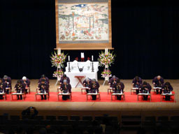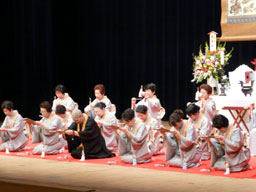 各宗派の僧侶たちが散華をまきながら入場 児童による献灯・献花
